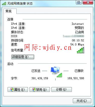 54Mb/s指的是最高传输速度为54Mb也就是54÷8=6.75MB/s,1B(Byte)=8b(bits)。这个速度是极限速度,网卡和路由器会根据距离的远近以及信号阻隔程度决定最终的速度(图2)。虽然54Mb数字并不大,但是对常用的2Mb/s ADSL来说已经足够了。我曾经蹭过几百米开外的一个无线路由器,虽然连接速度只剩下可怜的1Mb/s,但是浏览网页、下载小文件还算可以接受。