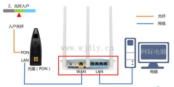 (1)、路由器的WAN接口,需要用网线,连接到猫的网口;如果你家的宽带没有用到猫,需要把入户的宽带网线,插在路由器的WAN口。