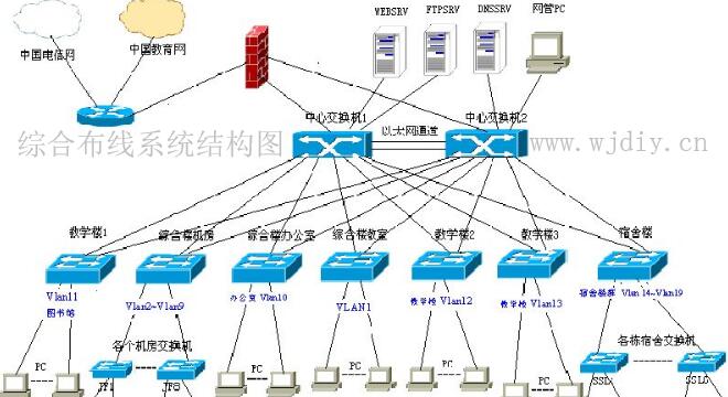 综合布线系统结构图-网络综合布线结构图:综合布线系统就是为了顺应发展需求而特别设计的一套布线系统。对于现代化的大楼来说,就如体内的神经,它采用了一系列高质量的标准材料,以模块化的组合方式,把语音、数据、图像和部分控制信号系统用统一的传输媒介进行综合,经过统一的规划设计,综合在一套标准的布线系统中,将现代建筑的三大子系统有机地连接起来,为现代建筑的系统集成提供了物理介质。可以说,结构化布线系统的成功与否直接关系到现代化的大楼的成败,选择一套高品质的综合布线系统是至关重要的。