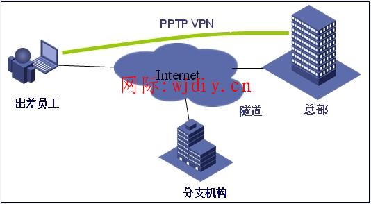 PPTP与L2TP适用于经常有流动人员远程办公的环境,出差员工利用Internet可以很方便的和公司的VPN网关建立私有的隧道连接。PPTP、L2TP提供认证加密功能,可提高网络的安全性。如下图所示,出差员工通过PPTP VPN连接至总部网络。