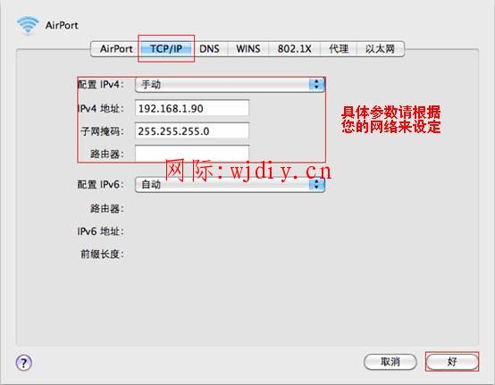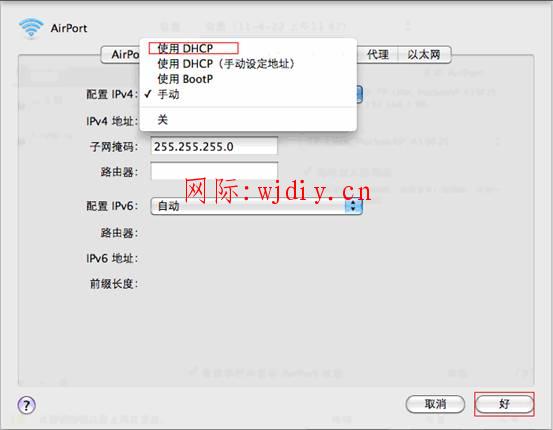 2. DHCP, 电腦自动获取IP地址等网络参数。进入“AirPort”网络参数设置页面,选择“TCP/IP”,进入IP地址设置界面,如下图所示。