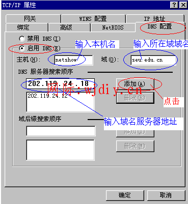 3.DNS:将“启用DNS”勾选,“主机名”与“域”随便填写,在DNS服务器搜索顺序里填写当地DNS地址(如不清楚,请咨询当地服务提供商),点击添加。