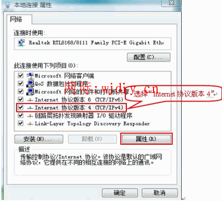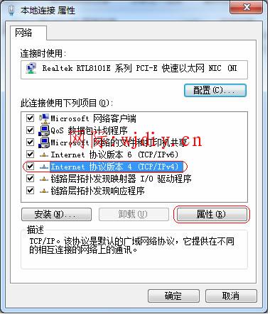 在网卡对应的“本地连接”选择“属性”→“网络”→“Internet协议版本4(TCP/IPv4)”,点击“属性”: