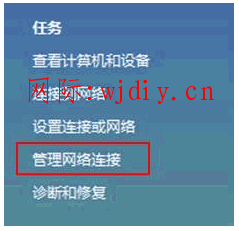 右击桌面网上邻居→选择“属性”→在网络管理侧边栏选择“管理网络连接”,