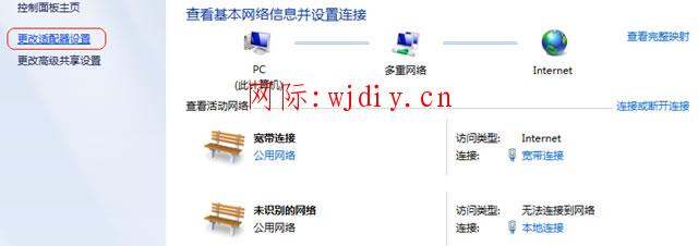 右击桌面“网上邻居”-选择“属性”,打开网络共享中心,在网络管理侧边栏中选择“更改适配器设置”: