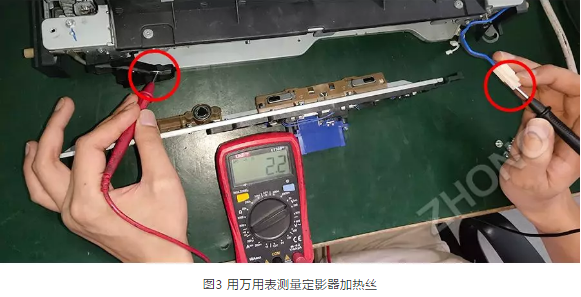 3.(由于出现这个代码定影器一般是不会加热)借助万用表测量定影器加热丝是否正常,两根线都导通说明加热丝正常(需要先拆开定影器),如果不导通说明加热丝已烧坏,如图3;