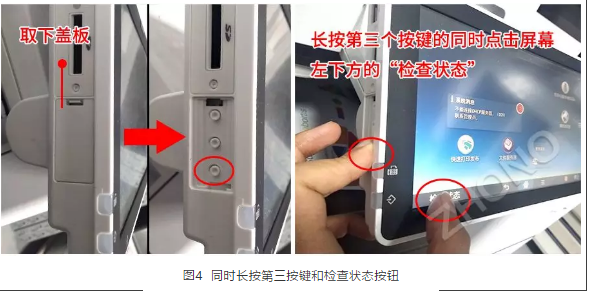 Step 1: 找到触摸屏面板、取下面板左侧隐藏的按键盖板,长按第三个按键的同时点击屏幕左下方的“检查状态”触摸按钮,进入虚拟按键界面,如图4;