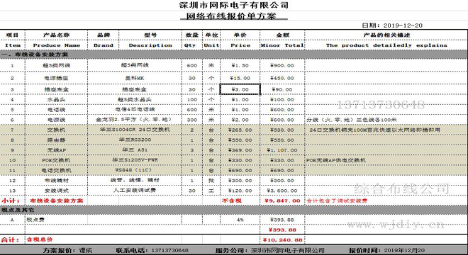 深圳网络布线报价单2019公司单位网络布线报价单方案:同一层楼30个工位!网线电话线电源插座;公司单位网络布线报价要求简单一点!所以网际电子综合布线公司提供如上图的一份公司单位网络布线报价表!