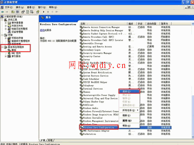 2、选择“ 服务与应用程序”—“服务”,选择右边窗口中的 “Wireless Zero Configuration”按右键选“