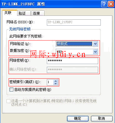 4、核对网络验证数据加密网络密钥设置是否和无线路由器中相同,如果是WEP加密,请确保密钥索引选择和