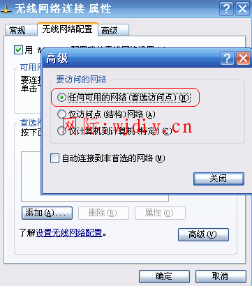 3. “无线网络配置”中点击“高级”,选择“任何可用的网络(首选访问点)”如下图。