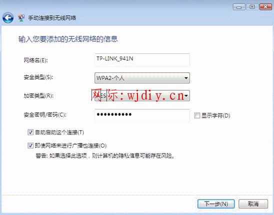 3.输入您要连接网络的名称,安全类型、加密类型、密钥与无线路由器中相关设置相同。