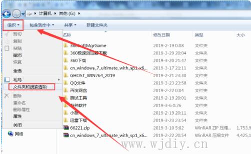 1、在需要显示隐藏文件夹的磁盘点击左上角的“组织”,选择“文件夹和搜索选项”。