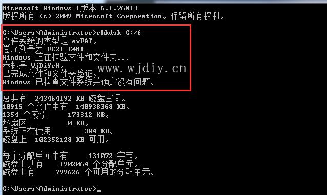 第四步、然后到管理界面输入代码:chkdsk G:/f (需要注意代码中的G代表的是答U盘的盘符,如果显内示是H,那就把G换为H) 。