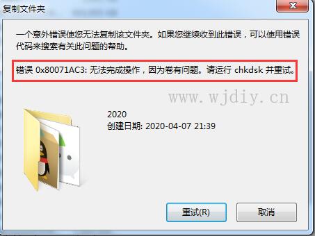 在使用U盘复制文件的时候提示:一个意外错误使您无法复制该文件,如果您继续收到此错误,可以使用错误代码来搜索有关此问题的帮助。错误0x80071AC3:无法完成操作,因为卷有问题,请运行chkdsk并重试。