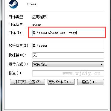 2、打开属性设置界面之后在目标一栏中加入空格键以及-tcp,然后使用确定按钮进行保存!