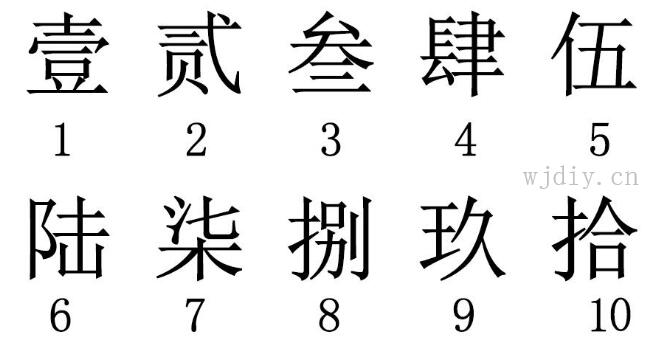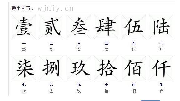 中文大写金额数字应用正楷或行书填写,如壹、贰、叁、肆、伍、陆、柒、捌、玖、拾、佰、仟、万、亿、元、角、分、零、整(正)等字样。不得用一、二(两)、三、四、五、六、七、八、九、十、念、毛、另(或0)填写,不得自造简化字。如果金额数字书写中使用繁体字,如貳、陸、億、萬、圓的,也应受理。