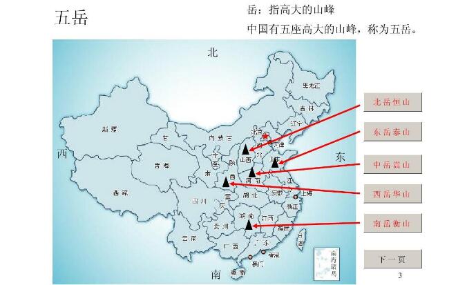 东岳泰山: 泰山坐落在山东省中部,为中国五岳之首,古称“岱宗”,主峰玉皇顶,海拔1545米,高度居五岳第三位,但它却被历代称为“五岳独尊”,原因首先是泰山平地拔起,山势雄伟,更重要的是泰山在中国的政治、文化历史上占有很高的地位,它是历朝统治者祭天的场所,目前山上有古寺庙22处、古遗址97处、历代碑碣819块、摩崖石刻1018处。