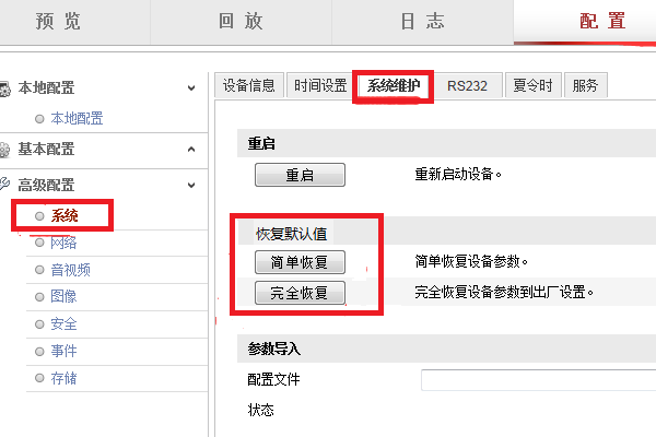 4、在配置菜单下,找到“系统维护”,点击“完全恢复”,将设备完全恢复至出厂设置。