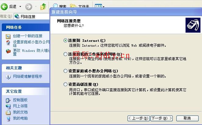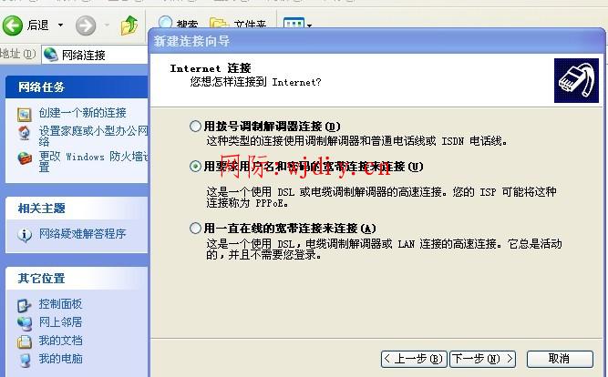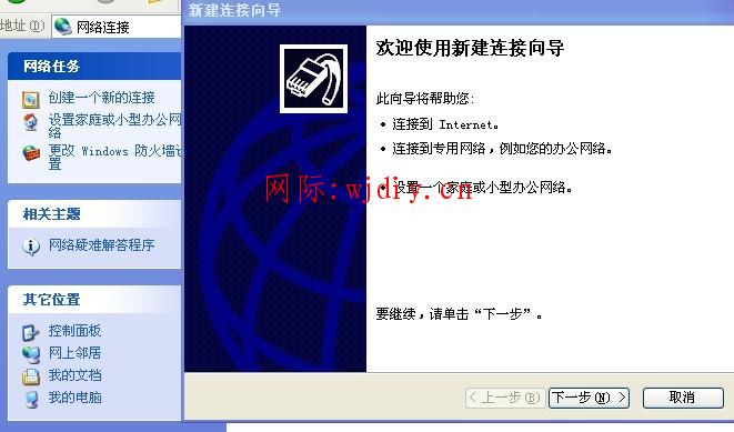 选择“控制面板”,选择“网络连接”,找到“创建一个新连接”(一般是窗口的左侧),点击再现“新建连接向导”窗口,