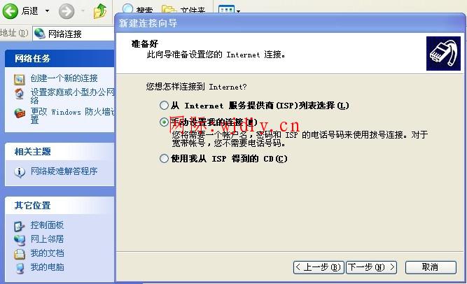 选择“下一步”,选择第一项“连接至Internet”点下一步,选择“手动设置我的连接”点下一步,选择第二项“用要求用户名