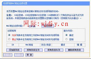 通常在路由器中有三种MAC地址过滤选项,关闭:关闭MAC过滤功能;允许:只有列在名单中MAC地址的设备才能上网;禁止:列在名单中MAC地址的机器不能上网。在使用时,必须先建立一个允许名单,把允许上网设备的MAC地址全都填写进去,只有列在白名单上的设备,才能通过路由器上网。