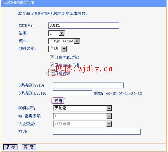 2.启用WDS功能重启完毕后,用更改后的LAN口IP地址重新登陆无线路由器A,在无线设置-基本设置中勾选“开启WDS”。点击“扫描”,搜索周围无线信号。