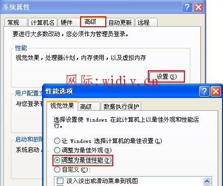 2、关闭系统属性的一些特效。在桌面上我的电腦点击鼠标右键,然后在下拉菜单中选择属性,然后在弹出的界面中,我们点击高级按钮,在高级界面中,我们点击性能栏目中的设置按钮,然后在弹出的界面中,我们选择调整为最佳性能即可。