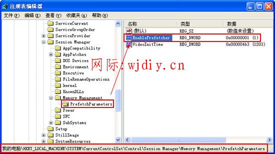 7、点击左下角开始,然后在弹出的界面中选择运行命令,然后输入regedit并回车,打开注册表命令,然后在里面按照路径找到HKEY_LOCAL_MACHINESYSTEMCurrentControlSetControlSessionManagerMemoryManagementPrefetchParameters,然后在右边界面中找到EnablePrefetcher,点击鼠标右键进行修改,设置数值为1,这样可以减少开机时候滚动条的时间。