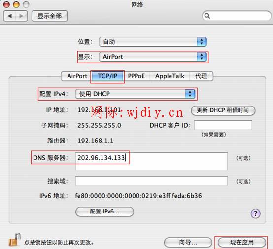 选择桌面图标“System Preferences”。在弹出的页面中选择“网络”。弹出网络连接设置页面,如下图所示,“位置”选择“自动”,“显示”选择“AirPort”,选择“TCP/IP”,即可设置无线网络参数(推荐使用DHCP)。