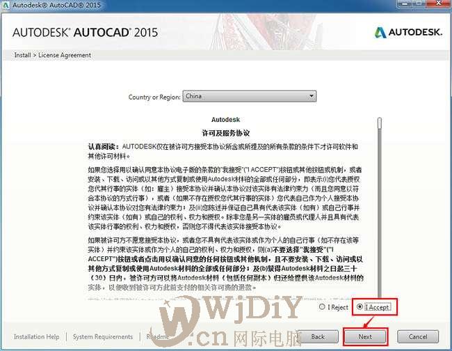 这里选择国家或地区为"china",然后选择我接受许可协议,再点下一步(I Accept) 第四步:安装CAD2015软件信息