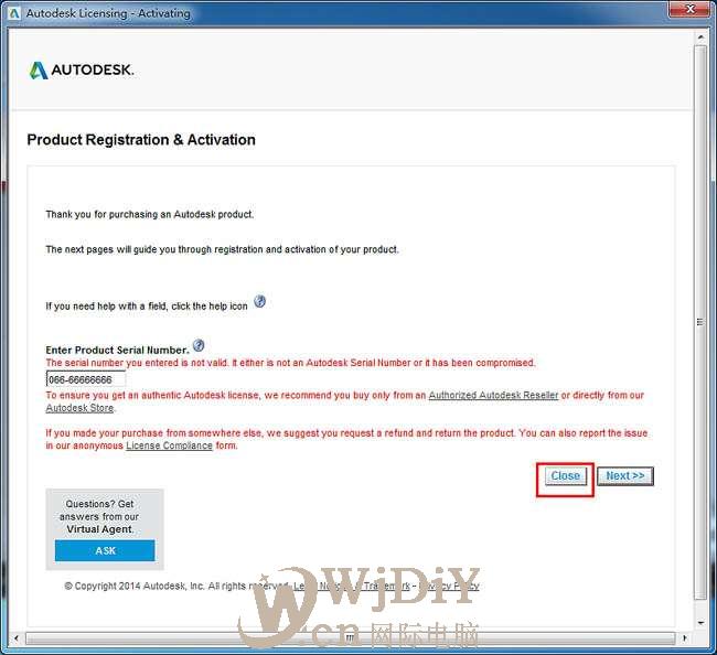 我们发现这里跟我们之前版本的CAD激活界面不一样,所以有两种激活方法,一种是断网激活,另外一种就是本教程要讲述的:我们先点击关闭,关闭这次激活,然后返回到之前的激活界面 ,再重新点击激活,这时我们会发现自动跳转到输入激活码界面。 第十三步:注册尚未完成,你确定要取消吗?