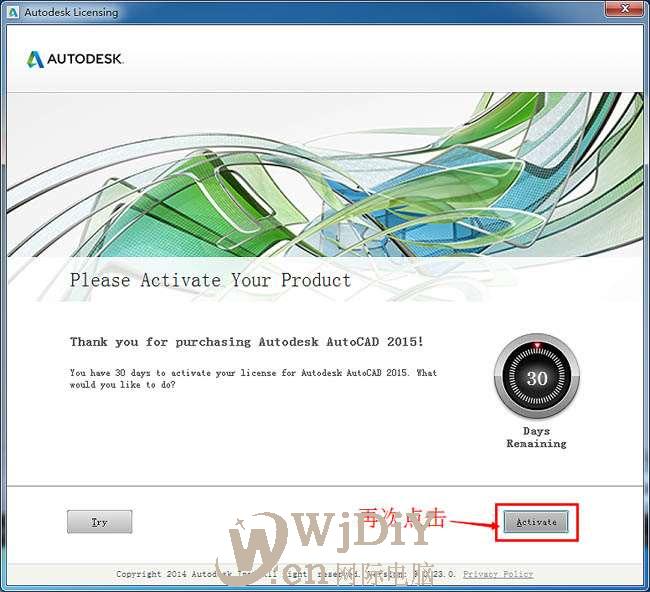 当注册尚未完成, 我们选择"确定"之后返回到CAD2015 64位英文版激活界面 ,重新点击激活,点击Activate 第十五步:打开注册机进行激活
