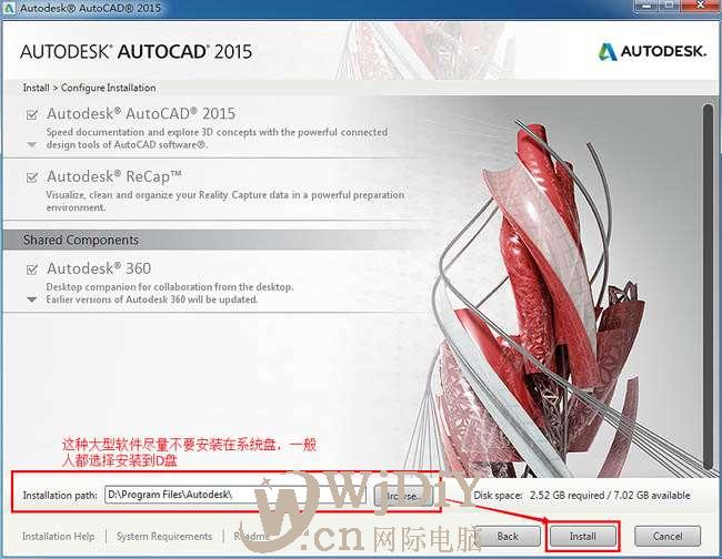 这种大型软件尽量不要安装在系统盘,找个空间足的盘,本人习惯将所有软件都安装到D盘,设置好盘符就点击安装。第六步:CAD2015 64位英文版安装进度