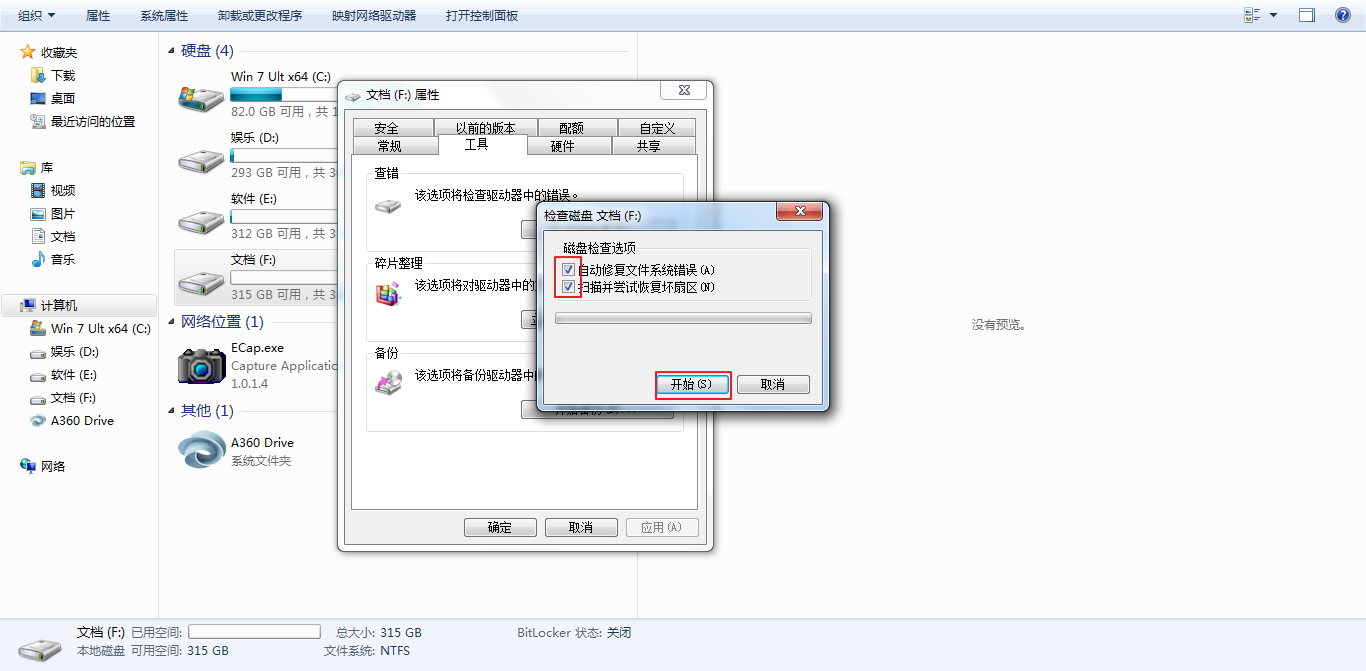 4、在弹出的小窗口中将“自动修复文件系统错误”和”扫描并尝试修复坏扇区“前面的勾勾选上,然后点击"开始"。