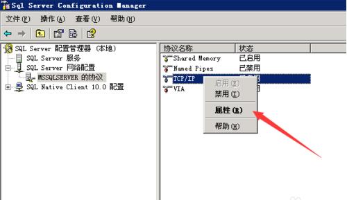 在SQL Server网络配置中选择SQLEXPRESS的协议,选择TCP/IP ,右键单击,选择属性