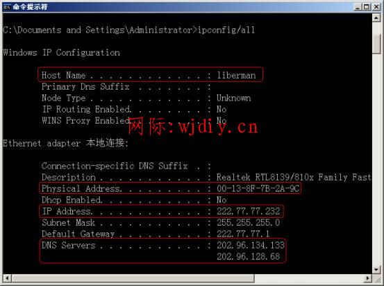 要发现和解决TCP/IP网络问题时,通常首先检查出现问题的电脑上的TCP/IP配置。使用ipconfig /all命令可获得全面的主机配置信息,如下图所示。既包括总体的IP配置信息,如主机名、IP地址、DNS、MAC地址等。