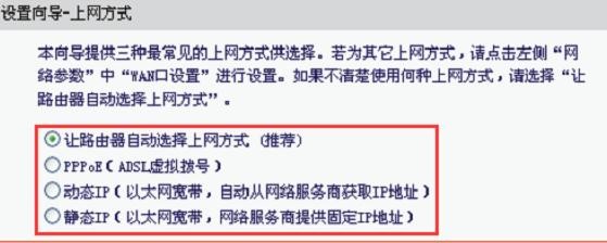 “让路由器自动选择上网方式(推荐)”这个选项不建议大家选择,因为有的时候路由器识别不准确,会造成无法上网的;所以,最好是手动选择上网方式的。