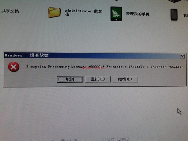Windows没有软盘,内容是Exception Processing Message c0000013 Parameters 764ebf9c 4 764ebf9c 764ebf9 提示下面有三项选择:取消 重试 继续 无论选哪个次对话框还是重复出现。。。。图文如下: