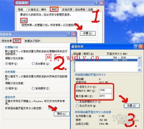 在“我的电腦”按右键 - 属性 - 高级 - “性能”框中的“设置”按钮 - “高级”选项卡 - “虚拟内存”框中的“更改”按钮