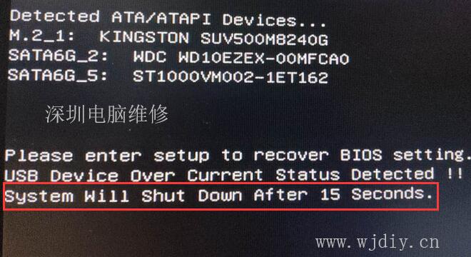 USB device over current status detected ,system will shut down after 15 second意思是:USB设备处于过电流流状态,系统在15秒后关闭。