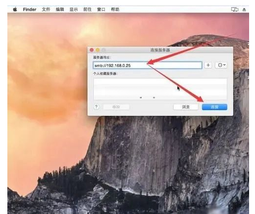 4、输入要共享的地址,格式为“smb://192.168.0.1” 其中的ip地址为你要访问的电腦ip。