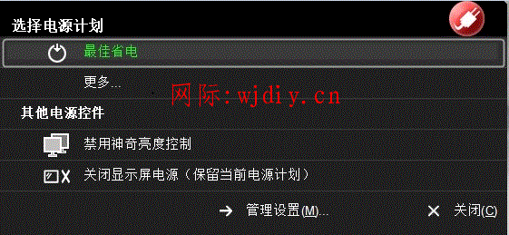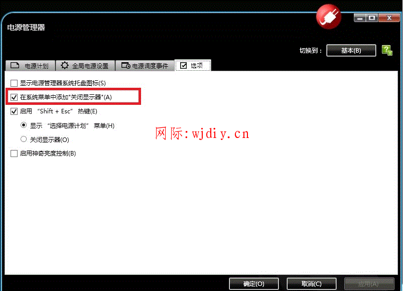 若菜单中无此选项,可通过电源管理软件“选项”卡,勾选“在系统菜单中添加"关闭显示器"(A)”即可。