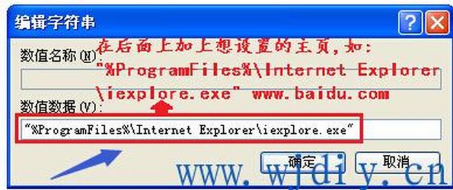 注意:有的人的电腦中的数值数据是:"C:\ProgramFiles\Internet Explorer\iexplore.exe",一样在后面加上网页的地址