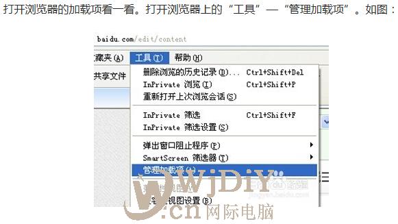 打开浏览器的加载项看一看。打开浏览器上的“工具”—“管理加载项”。flash 版本过低如图: