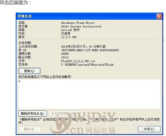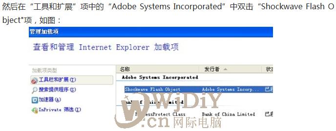 然后在“工具和扩展”项中的“Adobe Systems Incorporated”中双击“Shockwave Flash Object"项,如图: