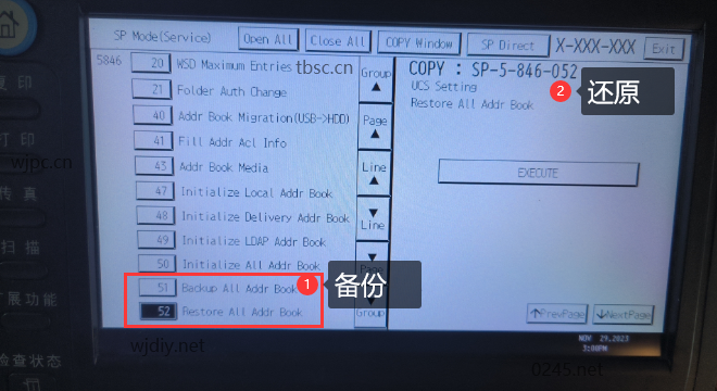 3. 执行SP5-846-051(备份全部通讯簿)。还原通讯簿