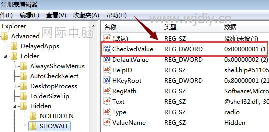 HKEY_LOCAL_MACHINE →Software→Microsoft→windows→CurrentVersion →explorer→Advanced →Folder→ Hidden →SHOWALL,将CheckedValue键值修改为1