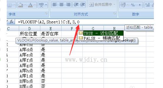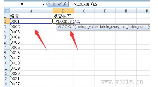 表图四:在是否在库的正下方编号对应的单元格里输入=vlookup进行查找引用的第一步操作.
