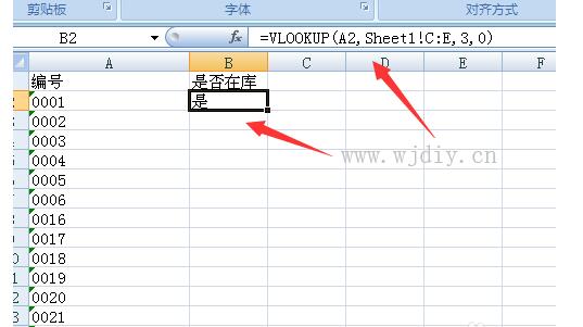 表图三:我要查找A库b点的被子在不在,怎么办呢?也就是要查找到编号是001的商品是不是在库.打开新的一页sheet2,用编号进行查找引用.并编辑好表头,"编号"和"是否在库".还要保证第一页引用的数据中编号在前,结果在后!!!!
